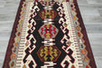 The central field of the rug showcases a series of bold geometric motifs, arranged in a striking vertical alignment. These motifs are framed by a brown background, creating a captivating contrast that enhances the intricate details.