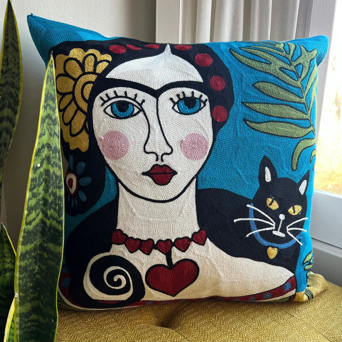 Hand Embroidered Picasso Style "Frida & Feline" Cushion Cover