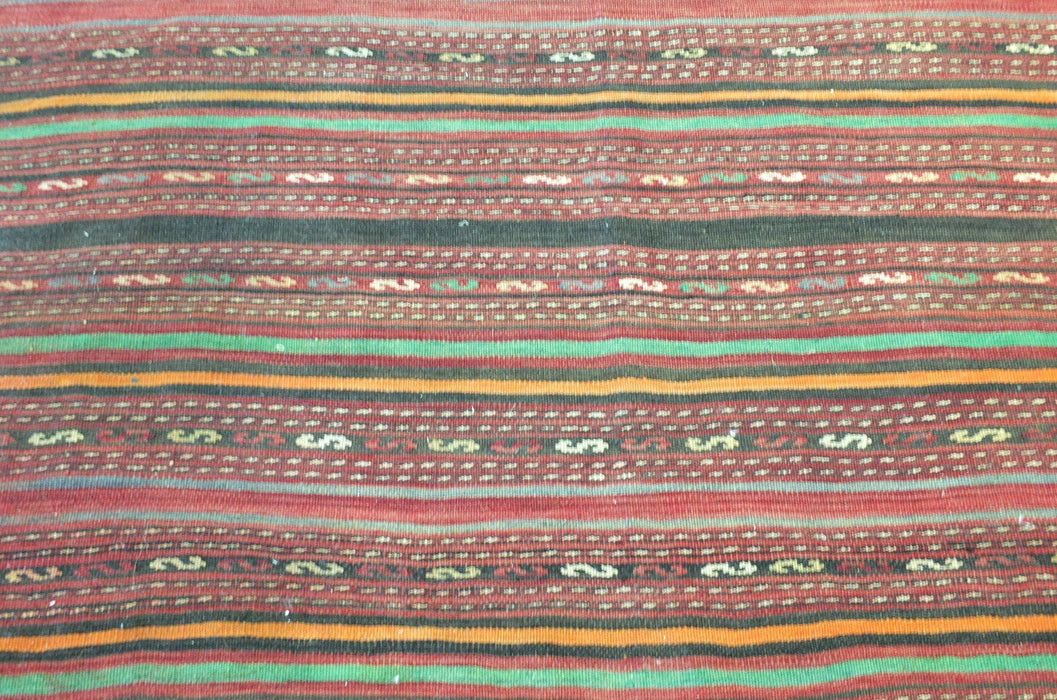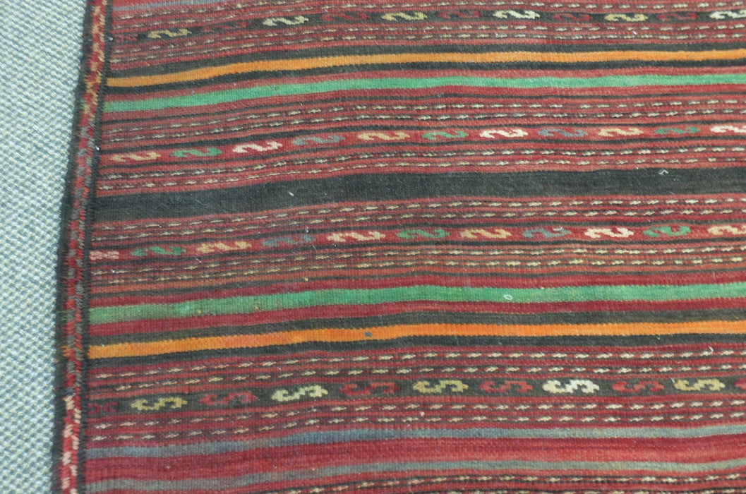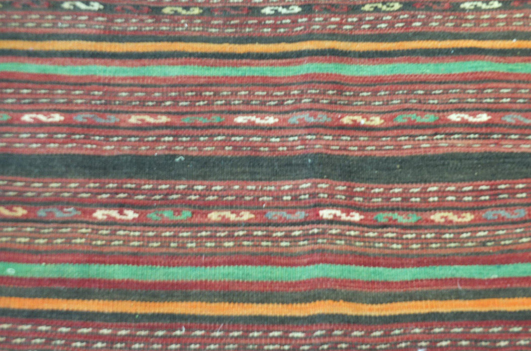 This Persian kilim with its diamonds within diamonds within angular outlining medallions is characteristic of the kilims of the Qashqai tribes. Kilim weaving is more or less an art of Qashqai and Lor rustic people living in Western part of Fars. The most active centers for weaving, which are also a populated region of Qashqai tribes, are Zakhrouyeh, Jegardan villages, and suburbs of Firuzabad.