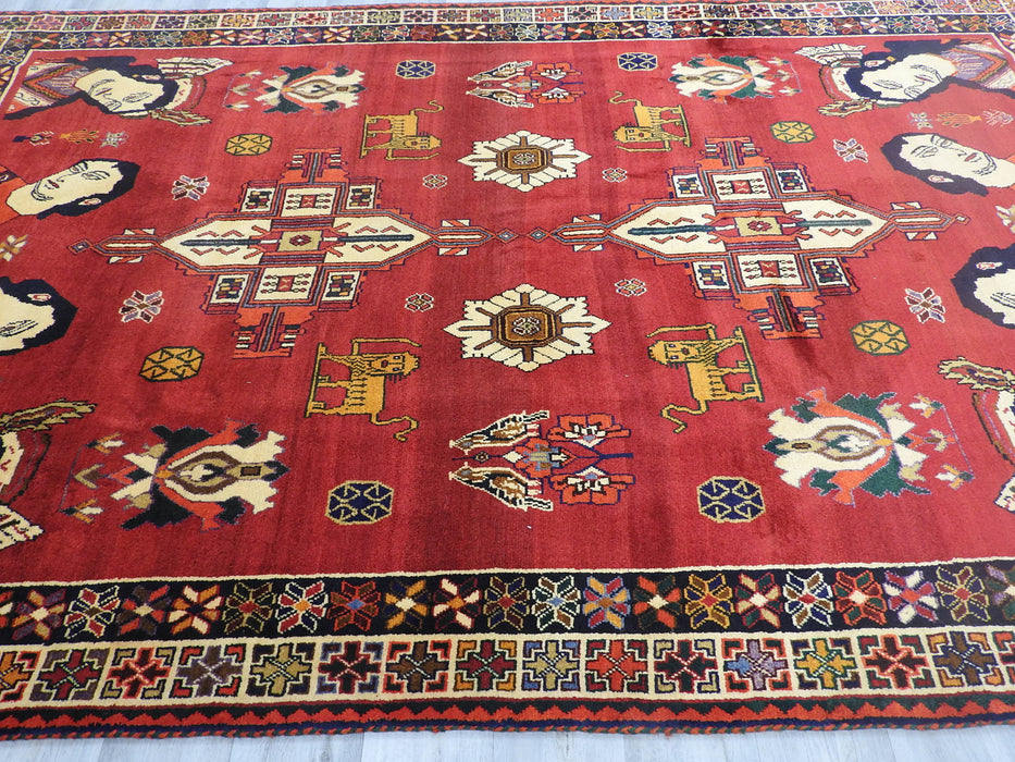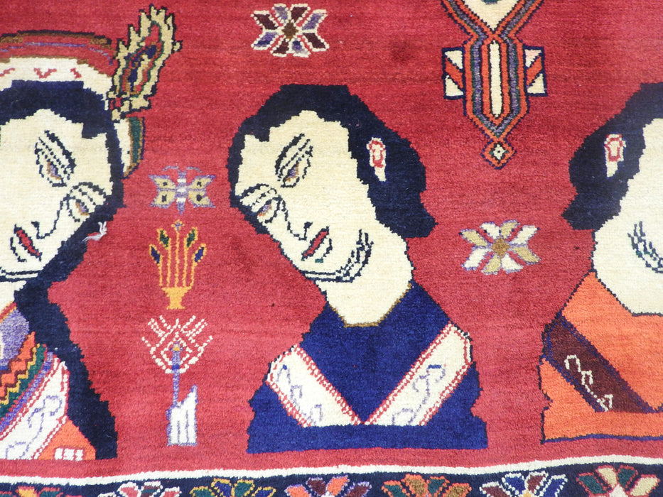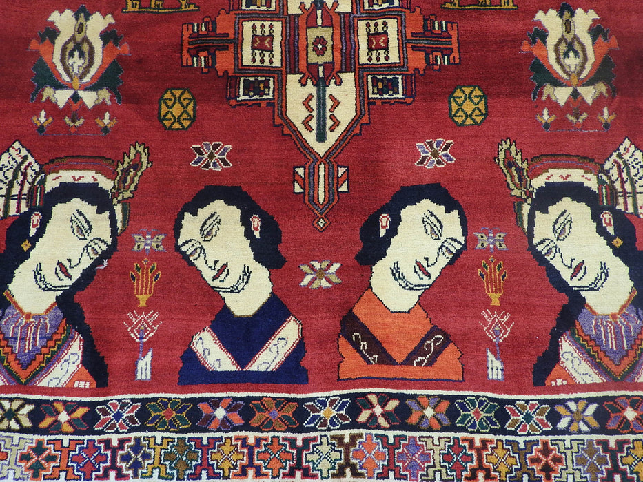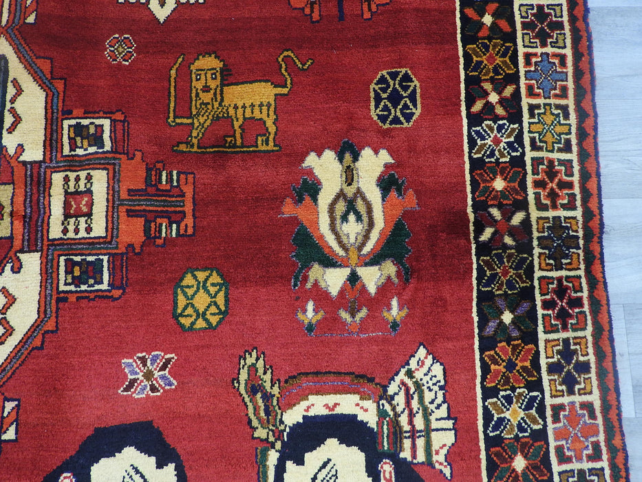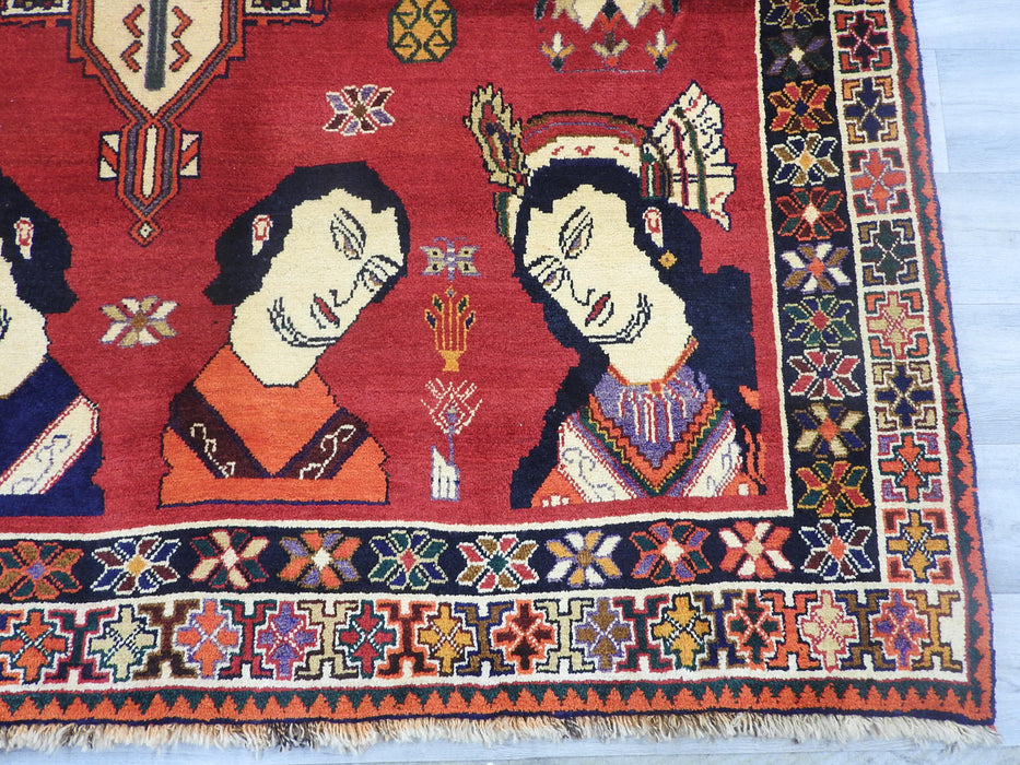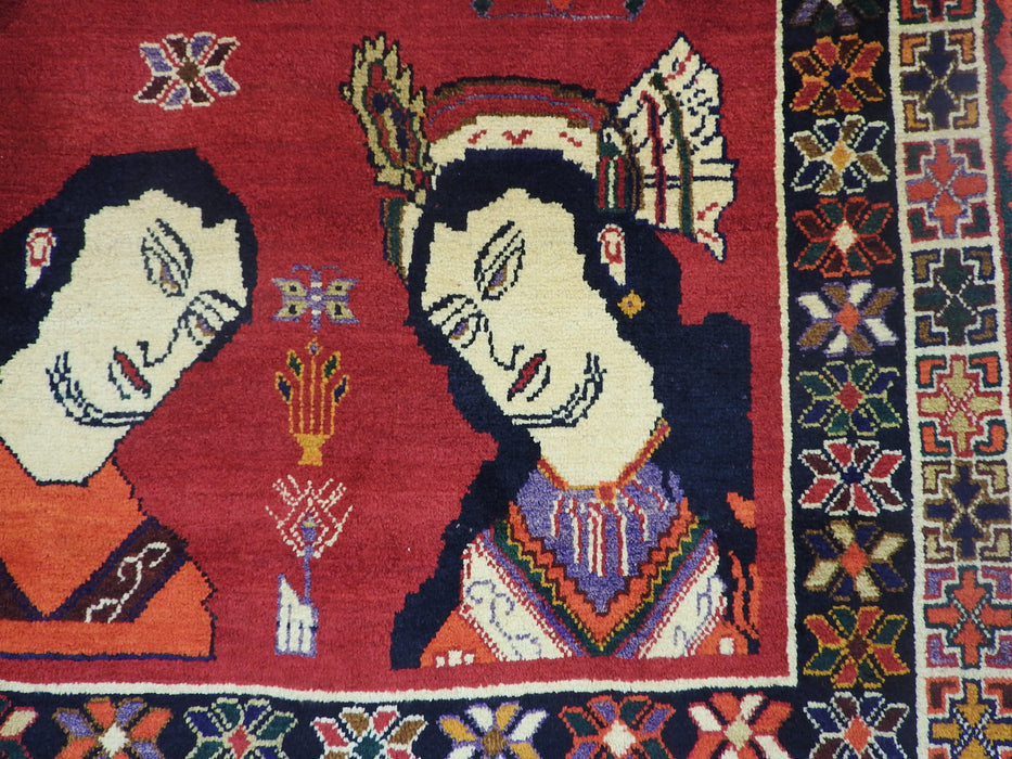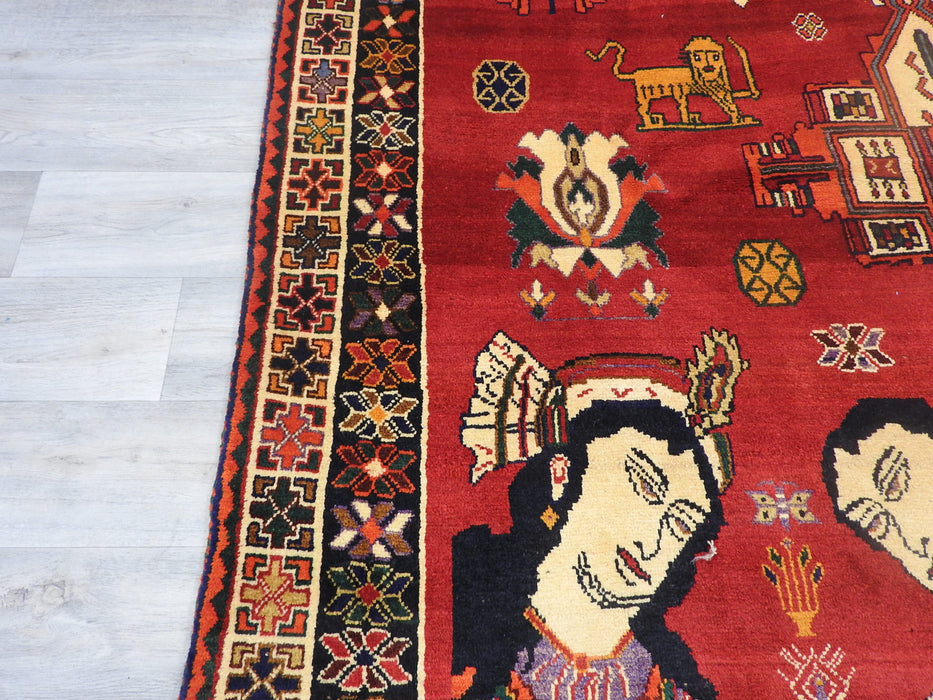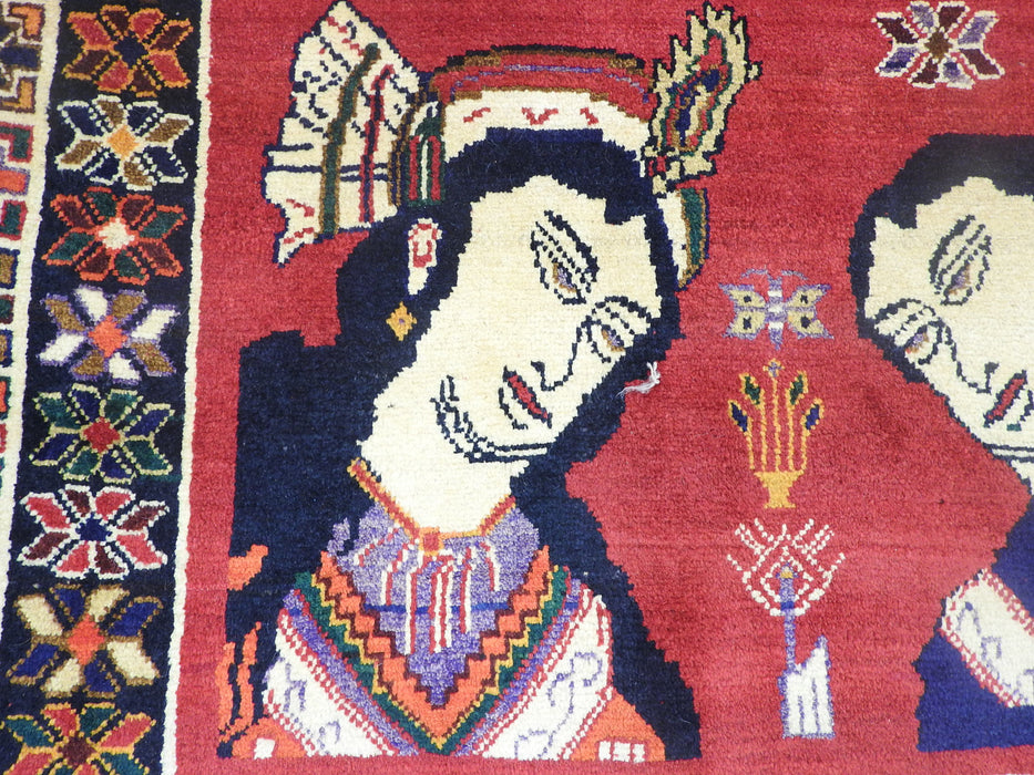 Pictorial Qashqai rug from the Shiraz region of southwest Iran. Rugs depicting romantic scenes, wine drinking, music festivities, and brokenhearted princesses are often known as ‘Omar Khayyam’ rugs. Generally, these are small mat-sized textiles but they also come in larger sizes such as this carpet.