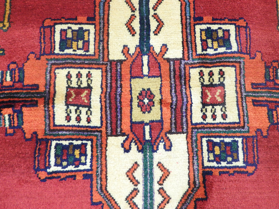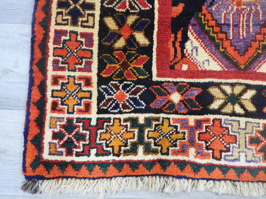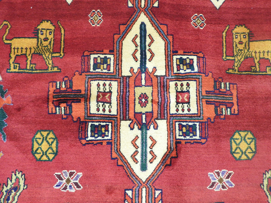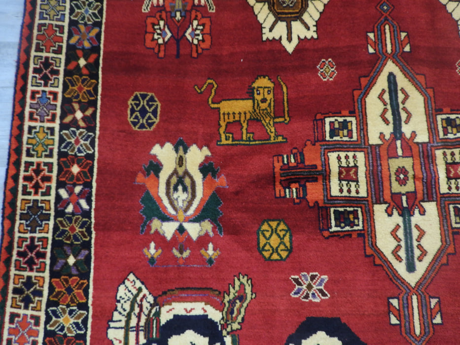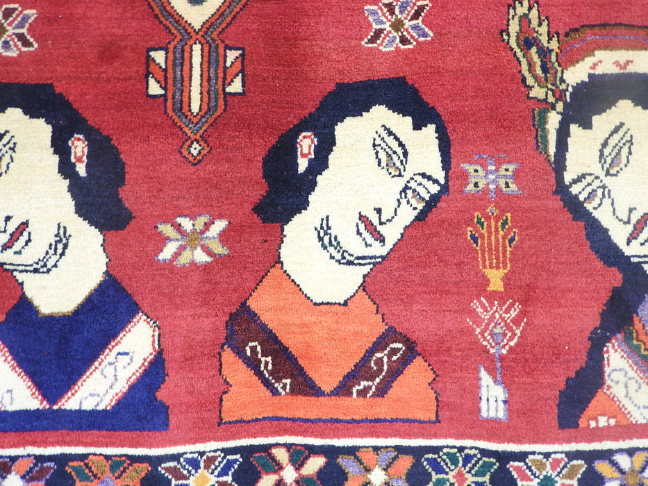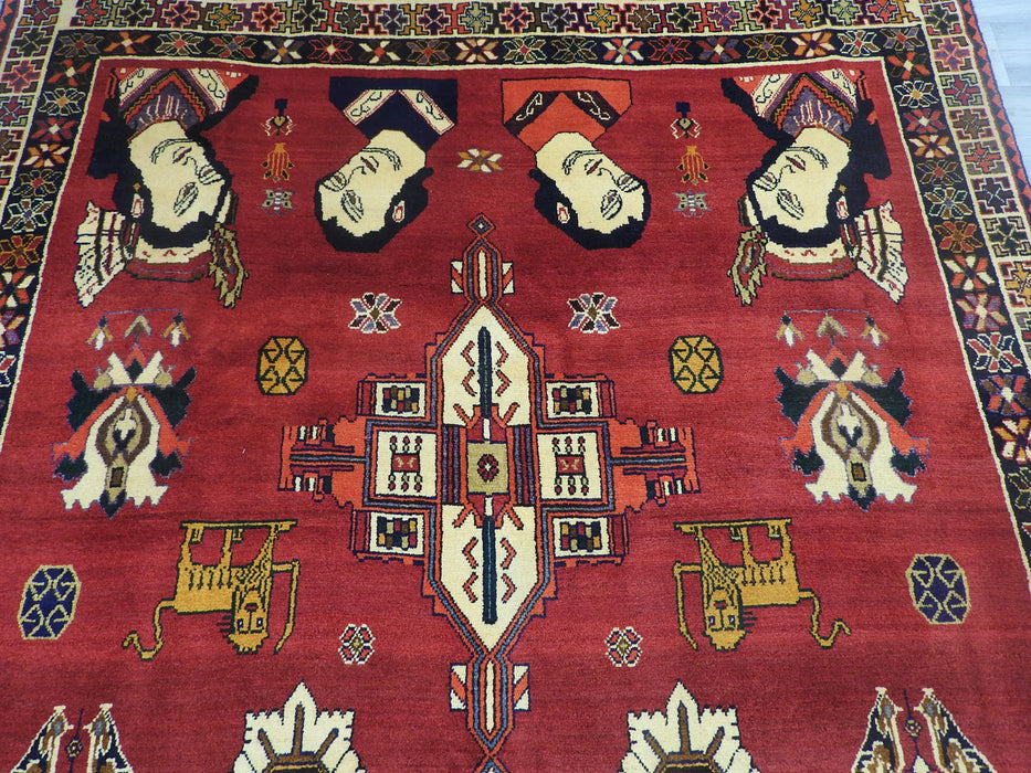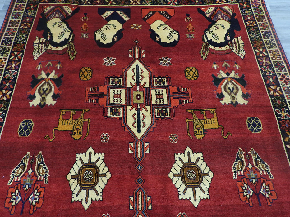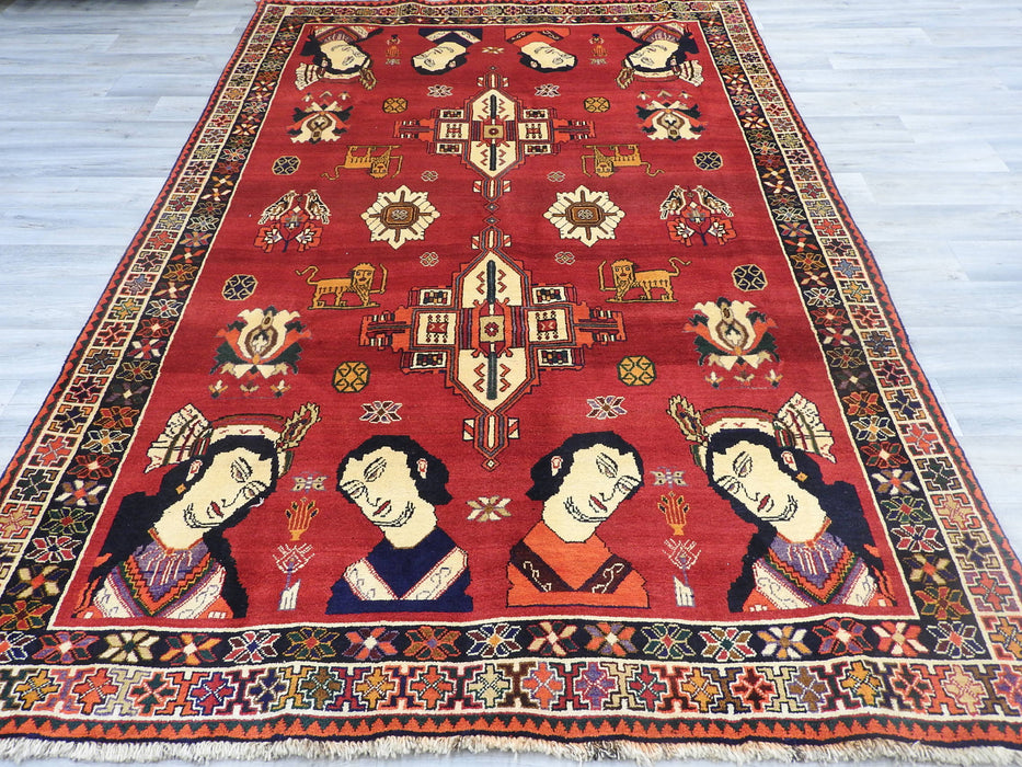 Pictorial Qashqai rug from the Shiraz region of southwest Iran. Rugs depicting romantic scenes, wine drinking, music festivities, and brokenhearted princesses are often known as ‘Omar Khayyam’ rugs. Generally, these are small mat-sized textiles but they also come in larger sizes such as this carpet.