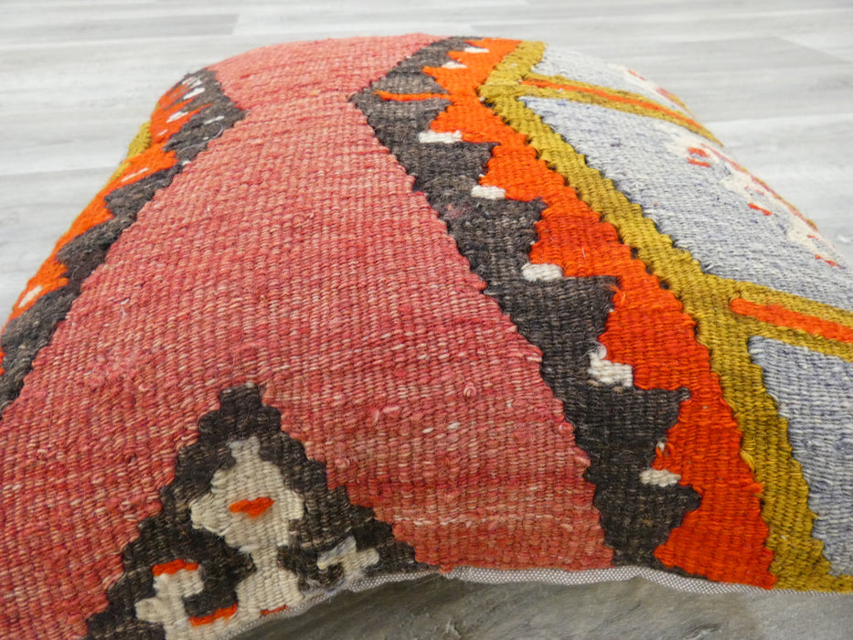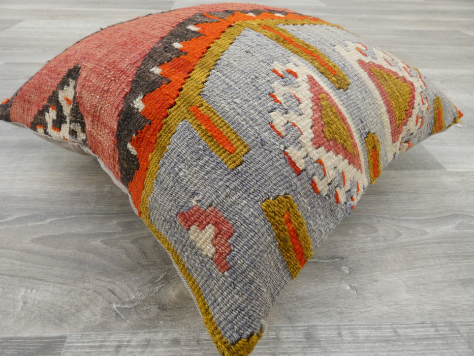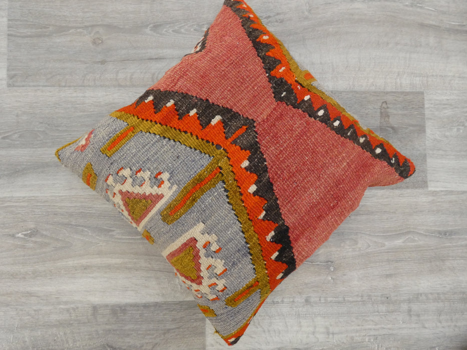 This beautiful Cushion was made from an authentic, vintage Turkish Kilim rug. Bright colours of wool adorn the front of the pillow and the cotton back has a hidden zipper enclosure. Makes a gorgeous addition to any couch, chair or bed.