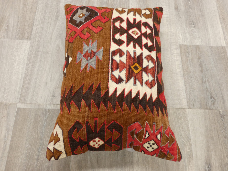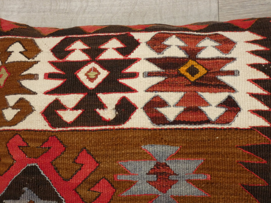 This beautiful cushion was made from an authentic, vintage Turkish kilim rug. Bright colors of wool adorn the front of the pillow and the cotton back has a hidden zipper enclosure. Makes a gorgeous addition to any couch, chair, or bed.