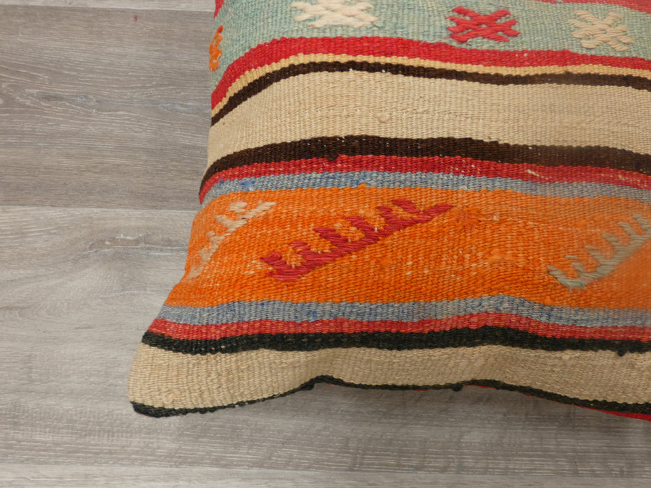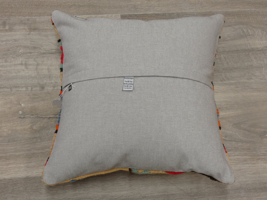 This beautiful Cushion was made from an authentic, vintage Turkish rug. Bright colours of wool adorn the front of the pillow and the cotton back has a hidden zipper enclosure. Makes a gorgeous addition to any couch, chair, or bed.