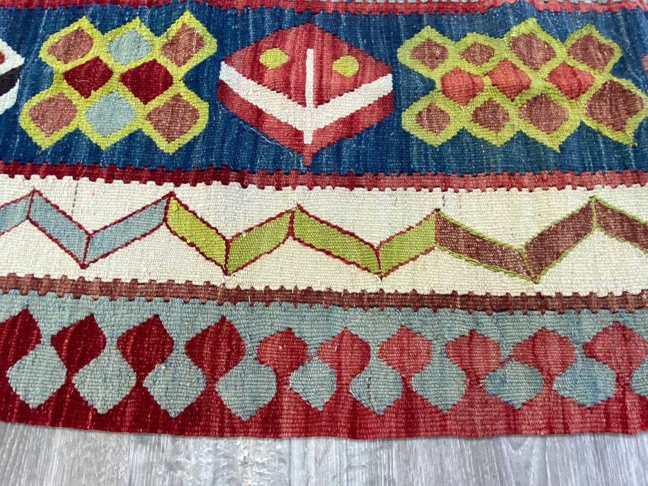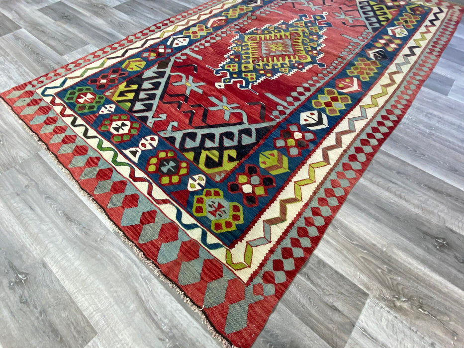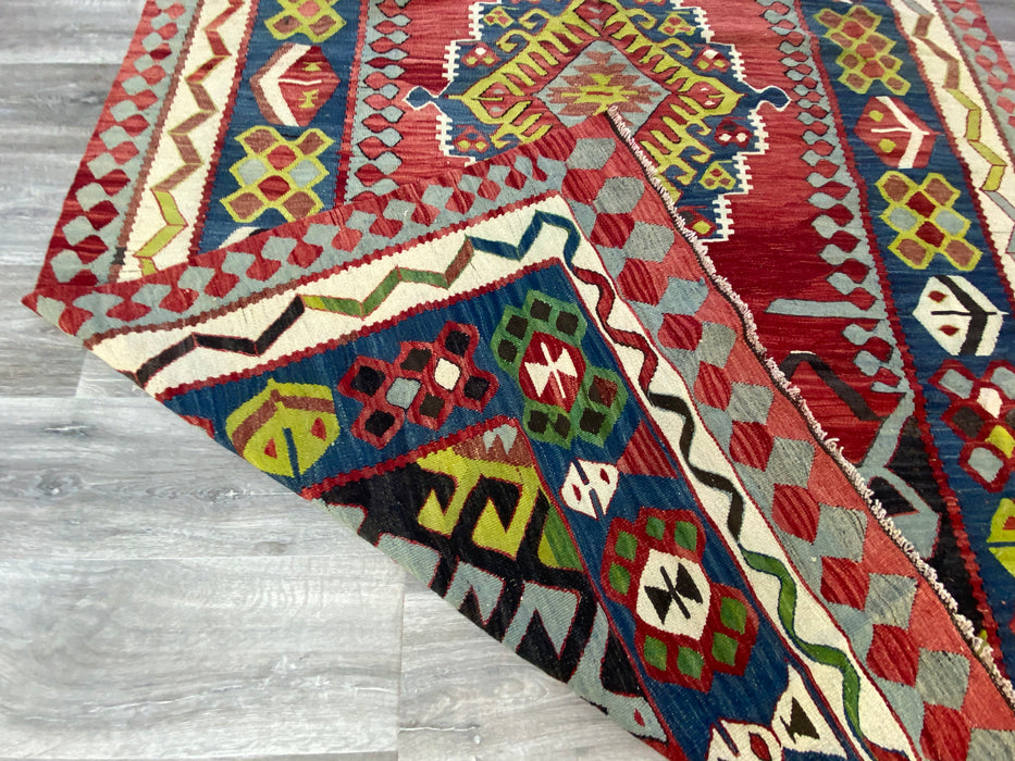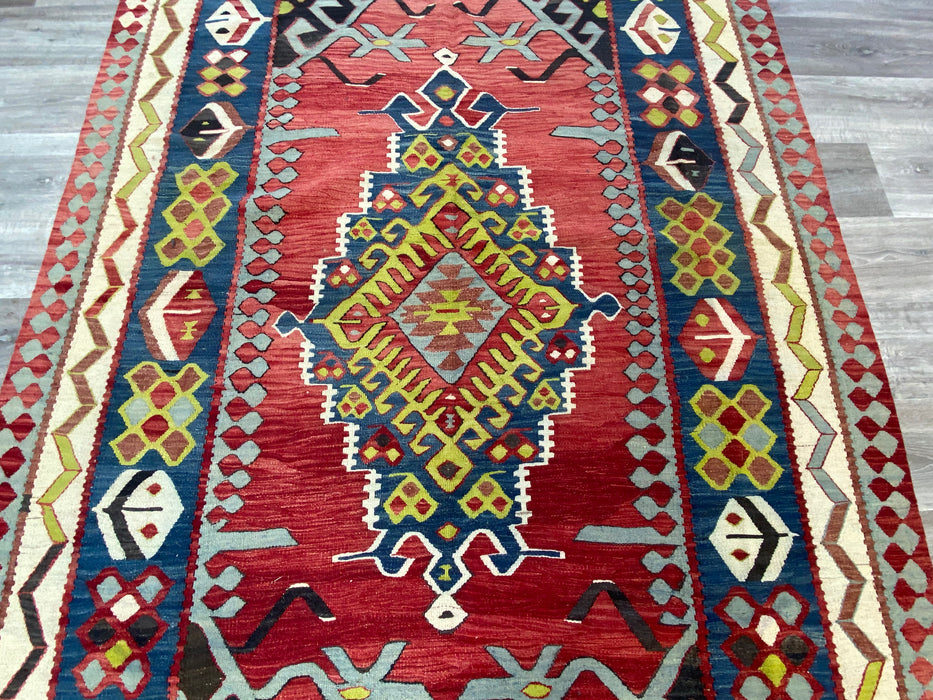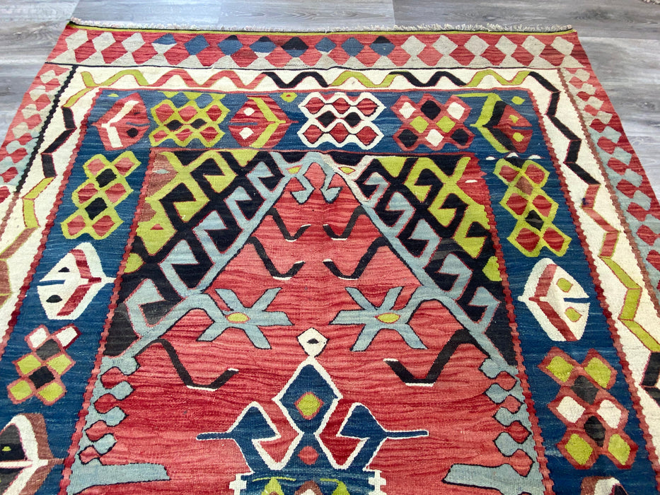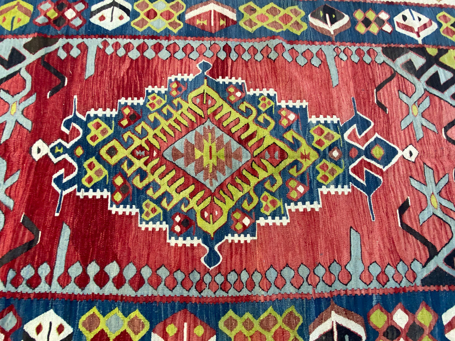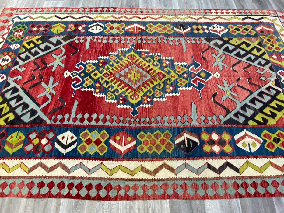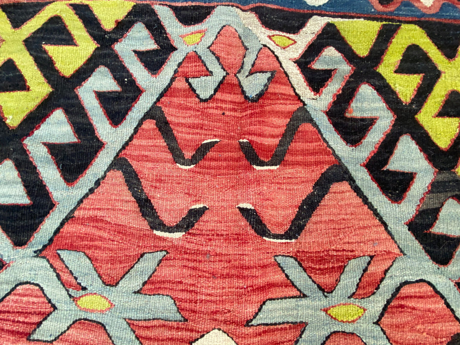 This vintage kilim rug has been woven by an Anatolian villager in 1970s in Esme, famous town of kilims and district of Oushak (Ushak) Province in the Aegean region of Turkey. It is a unique kilim rug.