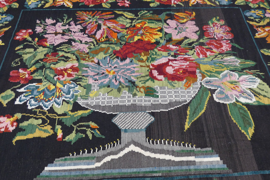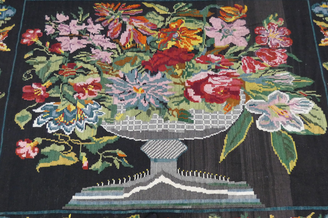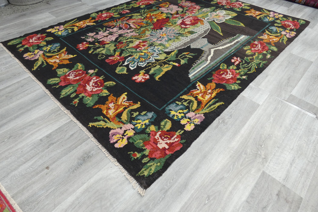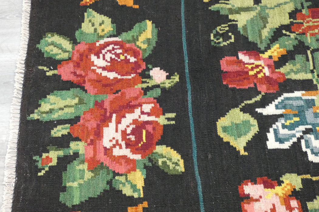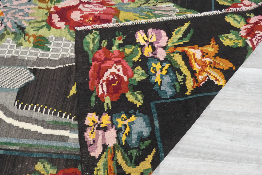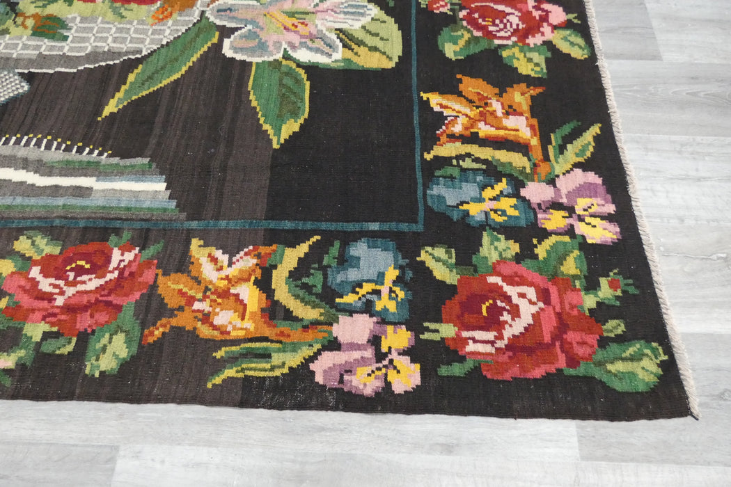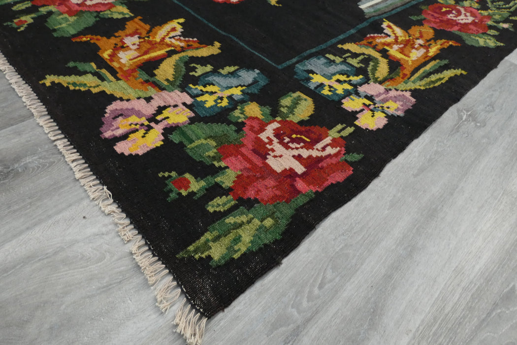 Presenting our exquisite Moldavian Kilim, featuring a captivating design with elegant floral bouquet at the center and an intricate, beautifully crafted rose border. The harmonious blend of colors and patterns creates a visually stunning piece that adds a touch of sophistication and charm to any room.